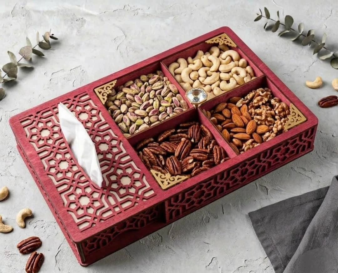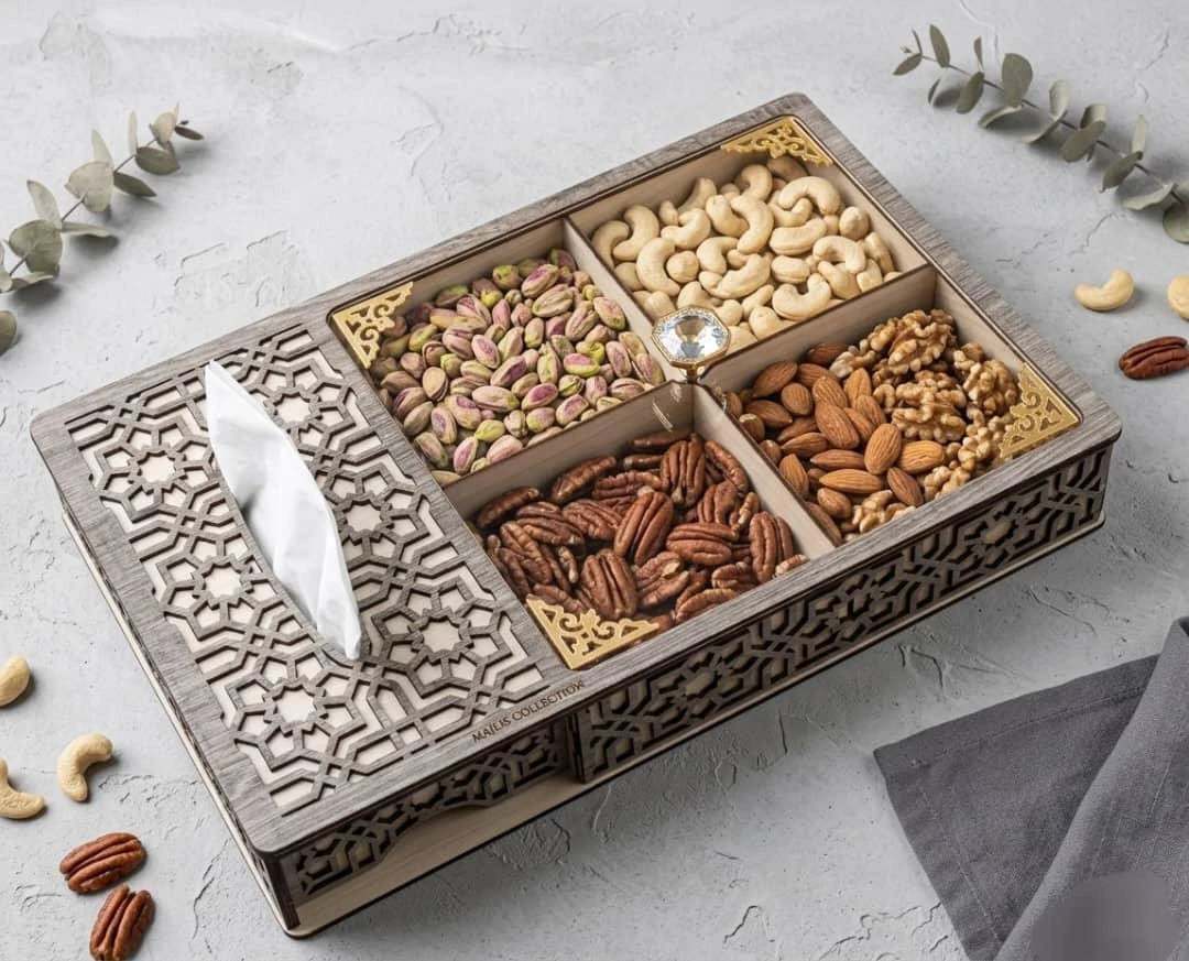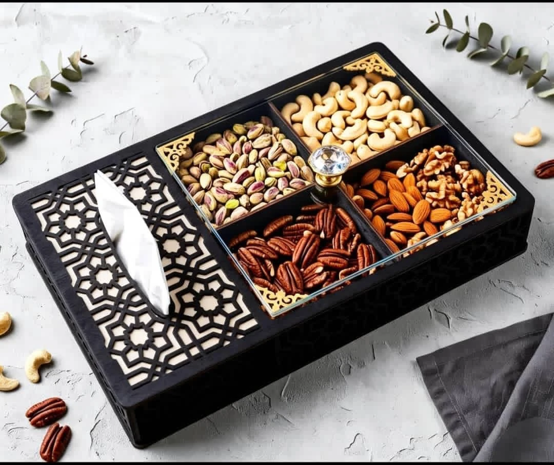 تحتوي على عدة أقسام مرتبة لتقديم أنواع مختلفة من المكسرات والحلويات بطريقة جميلة ومنظمة.